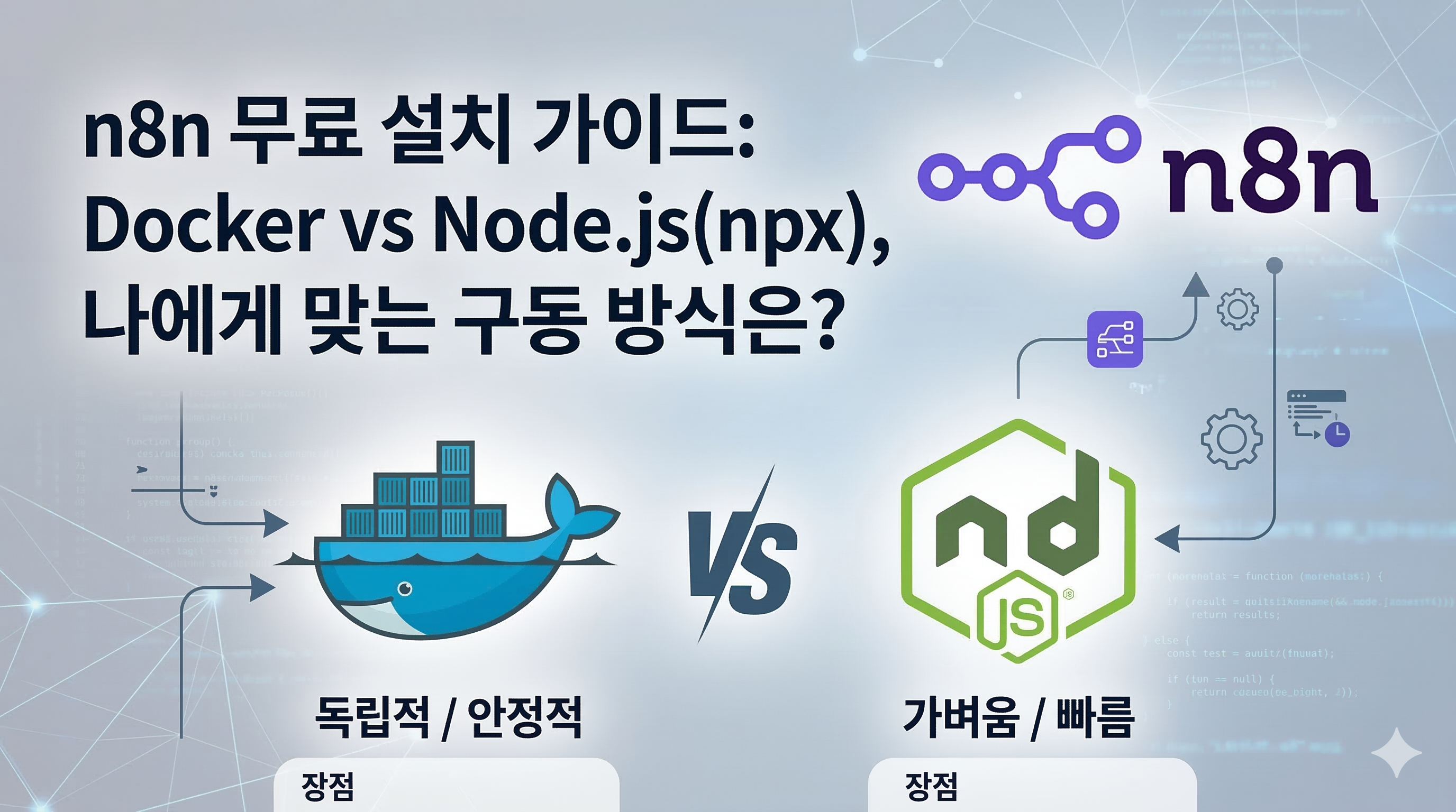 Node.js는 자바스크립트 런타임 환경으로, 내 PC의 운영체제 위에 n8n을 일반 프로그램처럼 직접 실행하는 방식입니다. 터미널에 npx n8n 명령어 하나만 입력하면 즉시 구동됩니다.