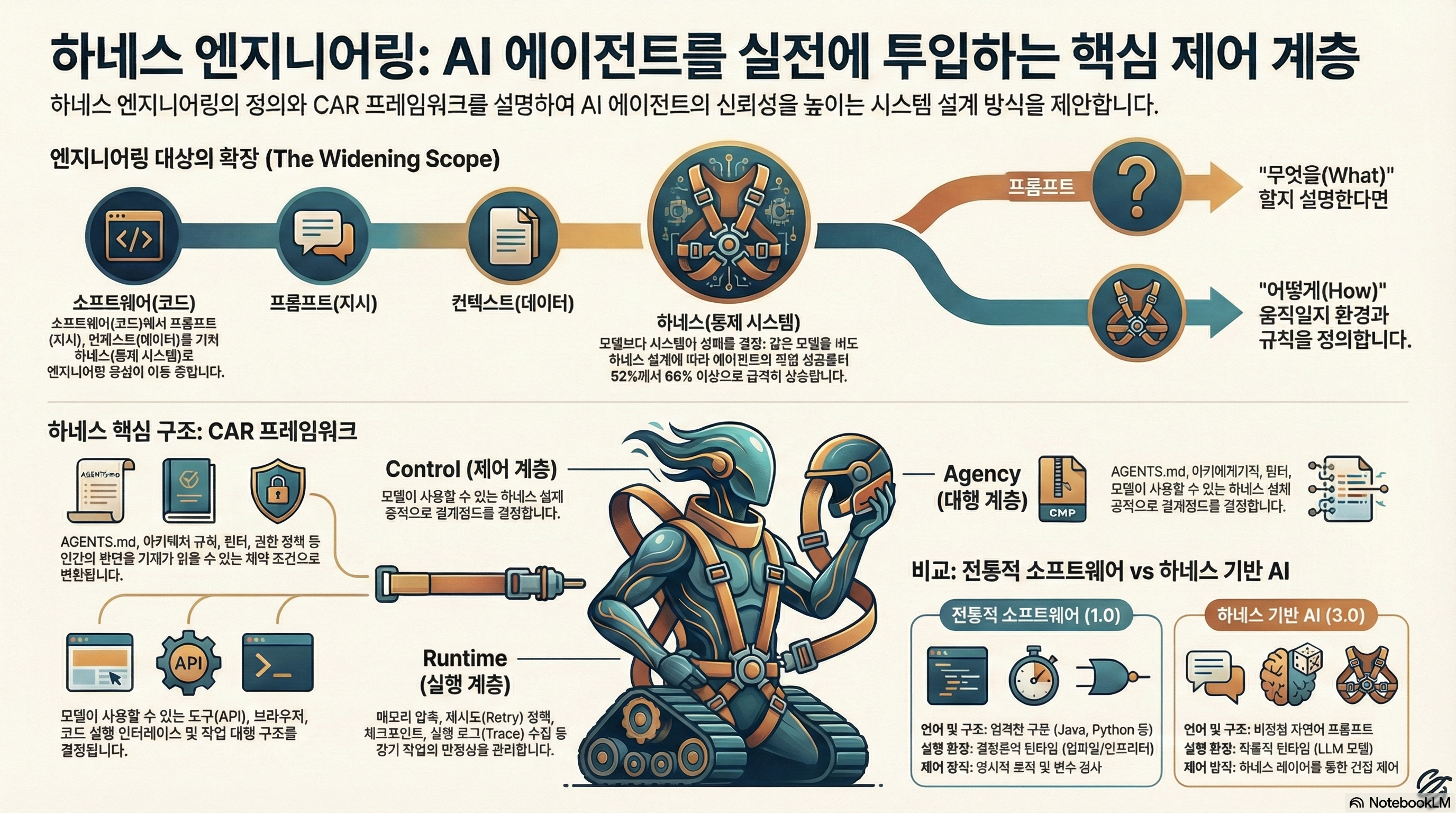 - 요지: AI 모델 자체의 성능보다 이를 제어하고 검증하는 주변 시스템(Harness) 설계가 미래 AI 활용의 핵심 경쟁력임.