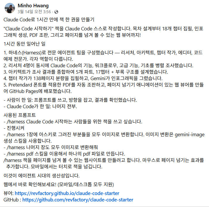 Claude Code로 1시간 만에 책 한 권을 만들기 "Claude Code 시작하기" 책을 Claude Code 스스로 작성합니다. 목차 설계부터 18개 챕터 집필, 인포그래픽 생성, PDF 조판, 그리고 페이지를 넘겨 볼 수 있는 웹
